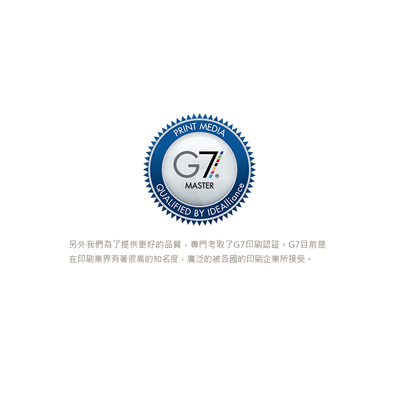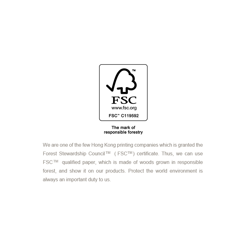 展譽設計印刷是香港少數取得森林管理委員會認證的印刷商之一,印刷用紙可使用負責任生長林區的木材(FSC™ 認證紙張),為保護地球環境出一分力。另外我們為了提供更好的品質,專門考取了G7印刷認証。G7目前是在印刷業界有著很高的知名度,廣泛的被各國的印刷企業所接受。除此之外我們亦都正在考取ISO9001。